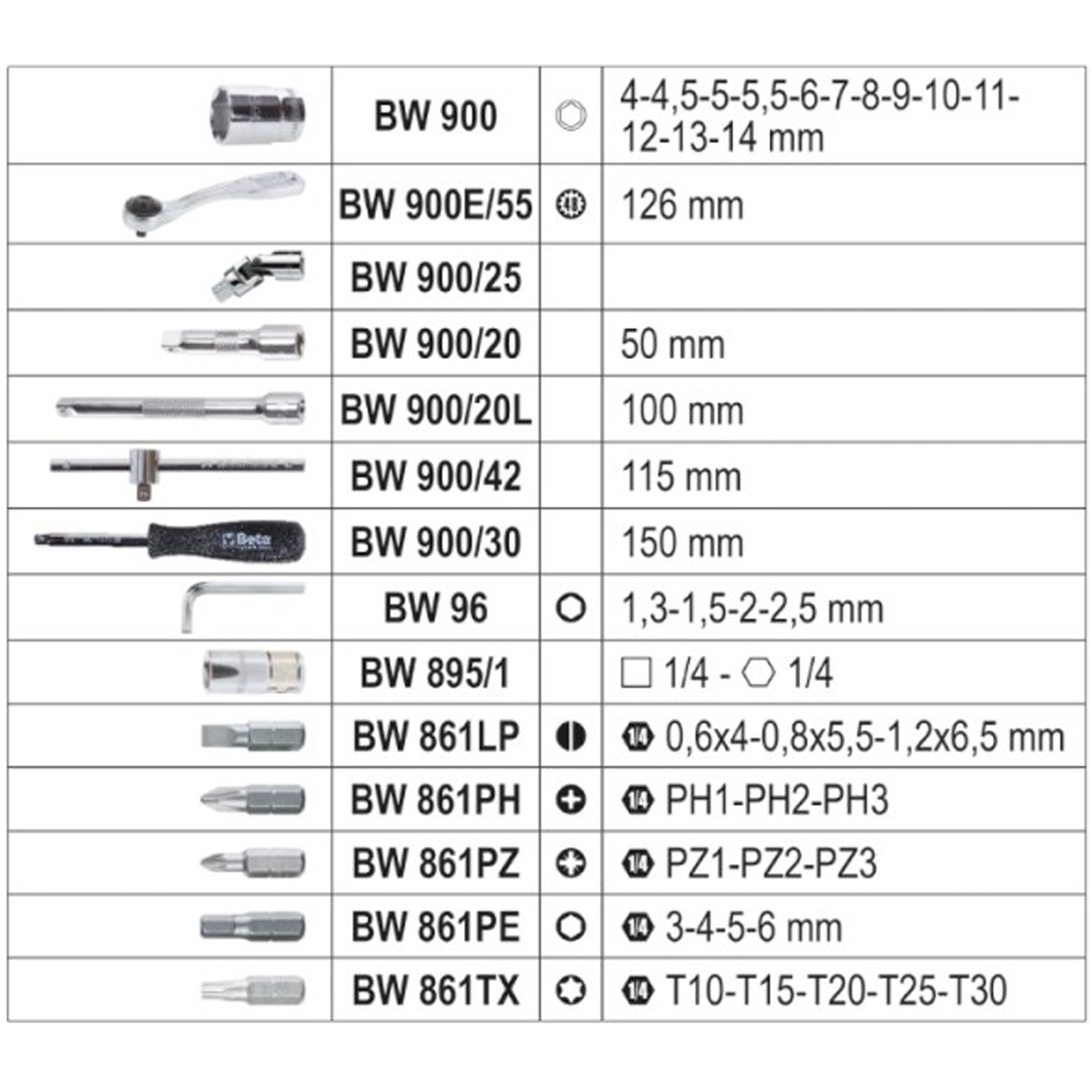 cod. BW 900 – Chiavi a bussola esagonali 1/4″ esagonale da 4-4,5-5-5,5-6-7-8-9-10-11-12-13-14 mm